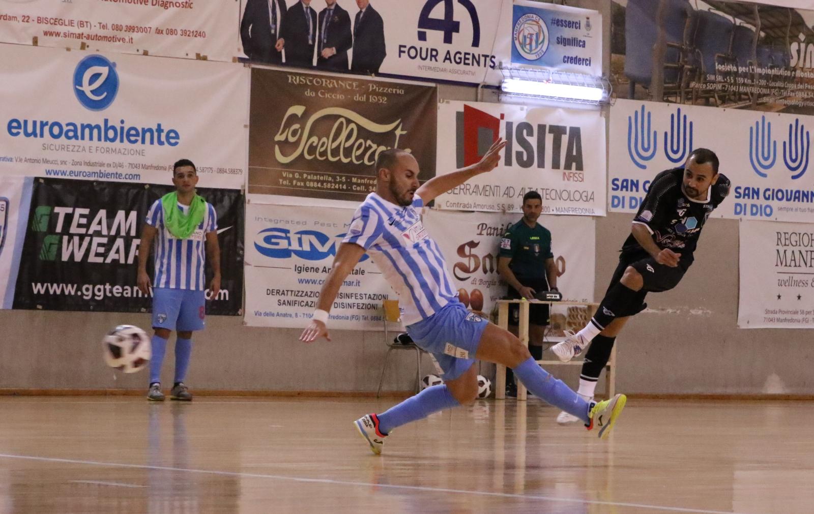 I locali collezionano diverse occasioni per pervenire al pari. Rafinha anticipa Raguso in extremis, poi al 9’27” episodio controverso. Canabarro batte fortissimo, palla che sbatte sulle mani del centrale bianconero ma per gli arbitri è tutto regolare. Veementi proteste al PalaScaloria. Fiuza in giornata strepitosa, respinge a ripetizione i tentativi di Caputo, Well, Persec e Boaventura. I garganici spingono alla ricerca del pari, che non arriva neppure quando Canabarro, nel cuore dell’area di rigore, tira centralmente sciupando una grande occasione. Fetic sui titoli di coda della prima frazione, sfiora il tris, mettendo a lato un pallone intercettato. Nell’ultimo minuto protagonisti i due portieri. Lupinella mura Felipe Mello, poi è ancora Boutabouzi a provarci ma l’estremo ospite è attento. All’intervallo è 1-2.