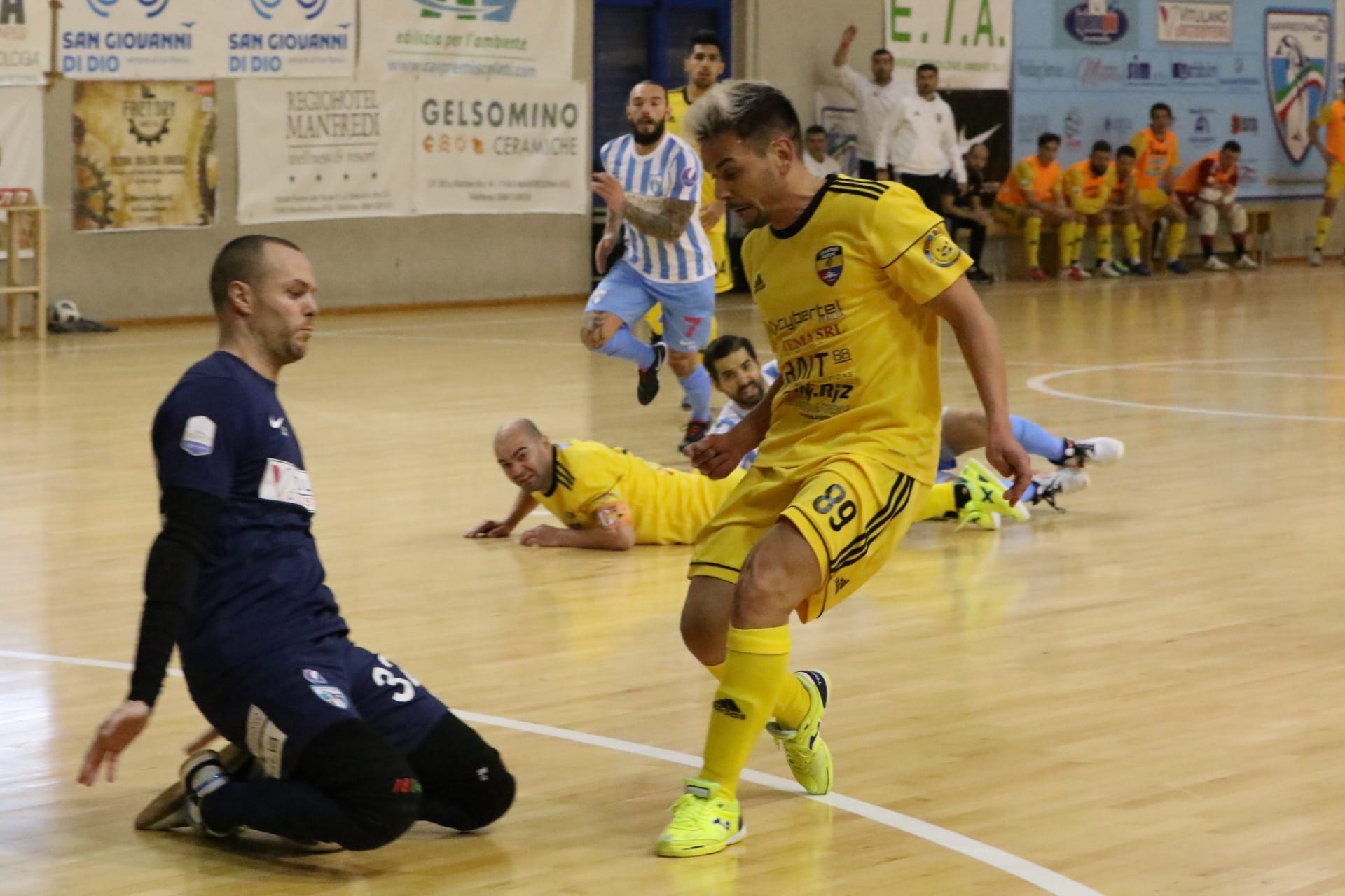 Gli aeroportuali mostrano sul parquet maggiore qualità ed aggressività, i sipontini non riescono a trovare sbocchi alla propria manovra e risultano spesso passivi e fragili difensivamente. Gli uomini di Ibanes, già da inizio match fanno capire che la serata sarà ardua per i biancoceleste. Portuga, va spesso via in banda sinistra e rifornisce Wilde e Divanei su cui è bravo Moretti. Una grande azione corale che libera al tiro Boaventura, la cui conclusione dà l’illusione del gol, non è la scinitilla che accende il Vitulano Drugstore C5 Manfredonia. Portuga ha ancora una doppia opportunità, prima che Divanei al 6’40” scaraventi in porta un violento destro, da poco fuori dall’area di rigore. Il vantaggio ospite dà il là alla vittoria legittima degli ospiti. Isi, al 10’15”, premia l’inserimento di Ferretti, che di piatto da solo, raddoppia. Boaventura ci riprova dalla distanza, a lato. Al 12’32” Raubo finalizza un bel assist di Portuga dalla corsia sinistra. Sussulto di Caputo, con una pregevole azione personale. Il brasiliano fa tutto bene tranne il piazzato fuori misura. Sul finire di tempo, Portuga fa poker con un tiro non trascendentale, e poi Diaz al 19’02” con il suo tap-in fissa il parziale sull’0-5.