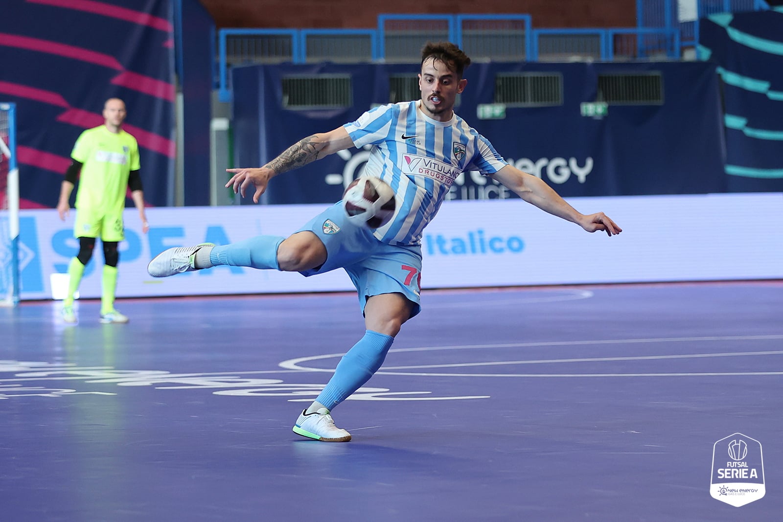 La ripresa si apre con Moretti che mette una pezza su una pericolosa palla di Dimas in area di rigore. Il Vitulano Drugstore C5 Manfredonia prova ad affacciarsi maggiormente in avanti. Boaventura dalla media distanza conclude alto sulla traversa. Crocco è decisivo intercettando la sfera destinata a Rafinha, sotto misura. Lo stesso centrale argentino, poi, recupera palla a metà campo e ci prova ma alza troppo la mira. Raguso scaglia un diagonale, da laterale, trovando la parata di Ducci. Ci prova anche Boutabouzi che va vicino al gol con una bella conclusione, che il portiere dei blues respinge di piede. Il match è più equilibrato e va a strappi. Pur non essendo una gara scorretta, i biancoceleste fanno incetta di gialli, per l’eccessiva fiscalità arbitrale. Ducci tenta vanamente di sorprendere Moretti con un rilancio dalla propria porta. Gli uomini di Monsignori rispondono con un pregevole dai e vai sull’asse Cutrignelli, Caruso, Cutrignelli ma il colpo d’interno del laterale barese è alto di pochissimo. Proteste vivaci della panchina sipontina su un contatto molto sospetto in area ai danni di Foglia. I garganici sono vivi e restano in gara. Monsignori a 6’ dal traguardo mette dentro il power play. La fase finale è avvincente. L’Olimpus sfiora il tris a ripetizione. Boutabouzi salva in extremis sulla linea su Dimas. Leandrinho devia il tiro a porta vuota di Grippi e Moretti risponde presente su Schininà in spaccata. Gli ultimi 90 secondi sono tutti di marca manfredoniana. Bagatini è provvidenziale allungandosi su Boaventura ad un passo dalla porta, prima della battuta a rete. Foglia tenta la sortita, sfera alta sulla traversa. Ancora Boaventura scaglia un preciso mancino a 39 secondi dalla fine, su cui Ducci si supera in angolo. Sugli sviluppi della azione successiva è ancora il numero 70 biancoceleste a sibilare l’incrocio. A fil di sirena il tiro centrale di Boutabouzi spegne le speranze del Vitulano Drugstore C5 Manfredonia e il suono finale sancisce il definitivo 1-2. Il Vitulano Drugstore C5 Manfredonia resta pertanto a quota 23 punti in classifica, in piena bagarre salvezza ed andrà a sfidare sabato 23 aprile, il Todis Lido di Ostia in un incrocio che si preannuncia ad alta tensione.