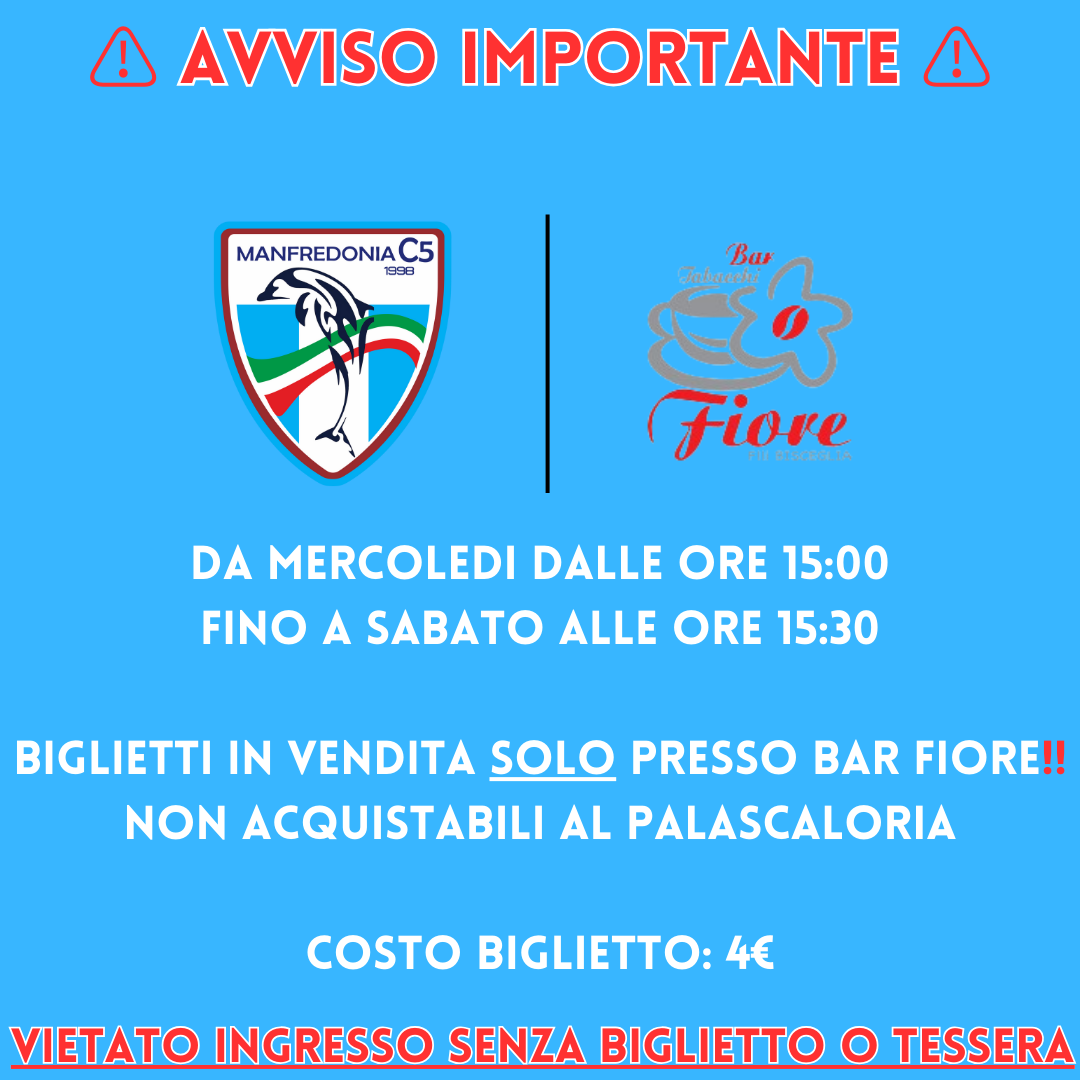 Si comunica che, per la terza giornata di campionato che vedrà affrontarsi Vitulano Drugstore Manfredonia e Città di Melilli al PalaScaloria di Manfredonia sabato 21 ottobre a partire dalle 16:00, i biglietti saranno acquistabili solo ed esclusivamente presso il Bar Fiore dei Fratelli Bisceglia. La vendita dei biglietti sarà effettuata da mercoledì 18 pomeriggio fino alle 15:30 di sabato 21.