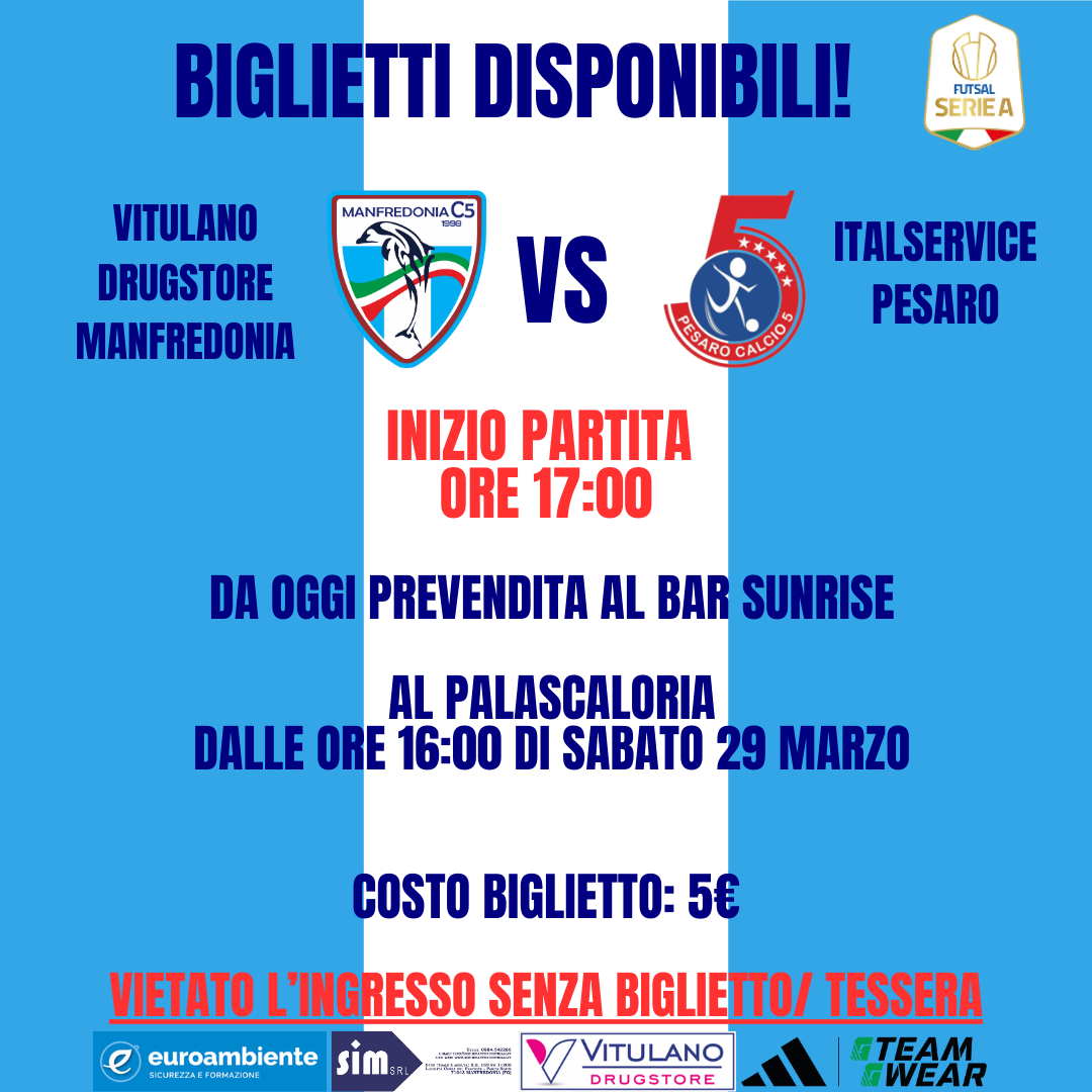 La società Vitulano Drugstore Manfredonia comunica che i biglietti validi per assistere alla partita contro l‘Italservice Pesaro, ventitreesima giornata del campionato di Serie A di futsal (ottava del girone di ritorno), sabato 29 marzo alle ore 17:00 presso il PalaScaloria di Manfredonia (FG), sono disponibili per l’acquisto.