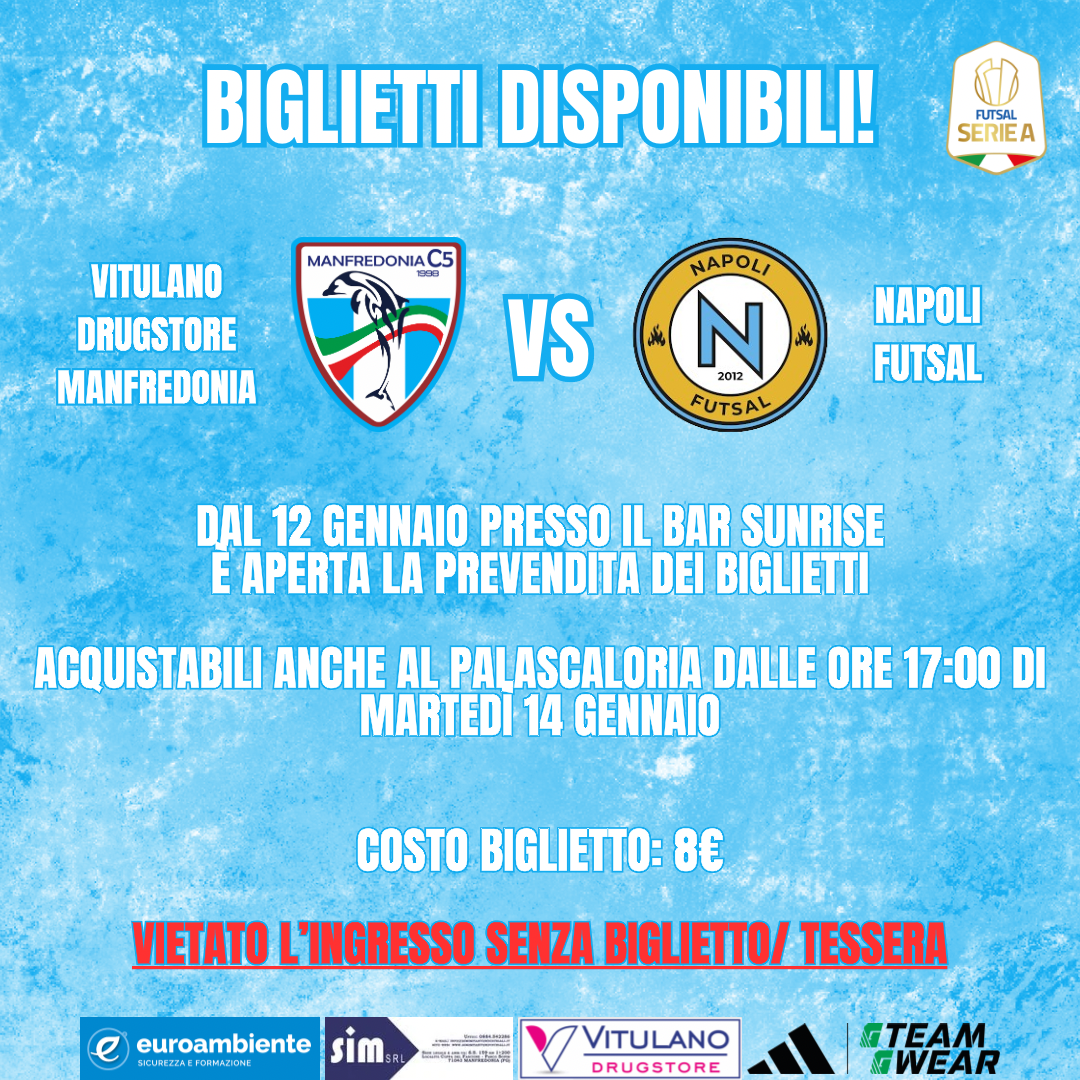La società Vitulano Drugstore Manfredonia comunica che i biglietti validi per assistere alla partita contro la Napoli Futsal, undicesima giornata del campionato di Serie A, martedì 14 gennaio 2025 alle 19:00 presso il PalaScaloria di Manfredonia (FG), sono disponibili per l’acquisto.