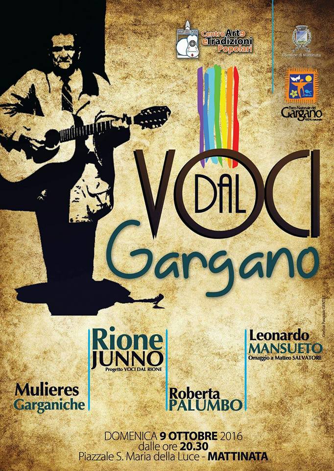 L’evento, organizzato dal centro Arte e Tradizioni Popolari, dal Parco Nazionale del Gargano e dal Comune di Mattinata, porterà in scena i ritmi della musica popolare tipicamente garganica interpretata dalle #MulieresGarganiche, composizione tutta al femminile di San Giovanni Rotondo, dal gruppo #RioneJunno che prende il nome dal più antico quartiere di Monte Sant’Angelo, dall’interprete apricenese Roberta Palumboche ha appena realizzato con il Parco del Gargano il progetto musicale “ #GarganoMio” e dal musicista mattinatese #LeonardoMansueto che omaggerà il cantastorie Matteo Salvatore.