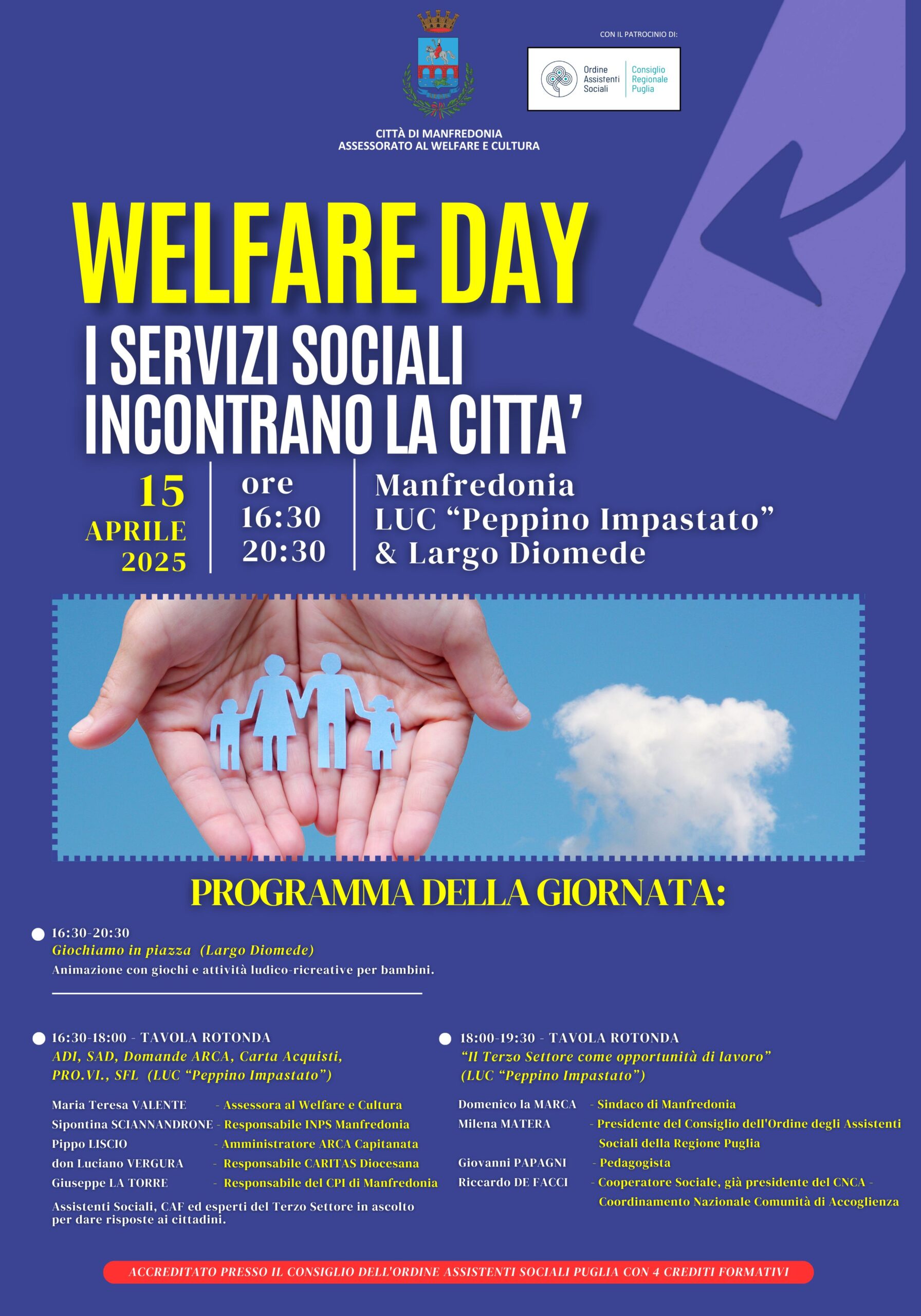 WELFARE DAY: IL 15 APRILE A MANFREDONIA UN EVENTO PER CITTADINI, FAMIGLIE, OPERATORI PER CONOSCERE DIRITTI E OPPORTUNITÀ NEL SOCIALE