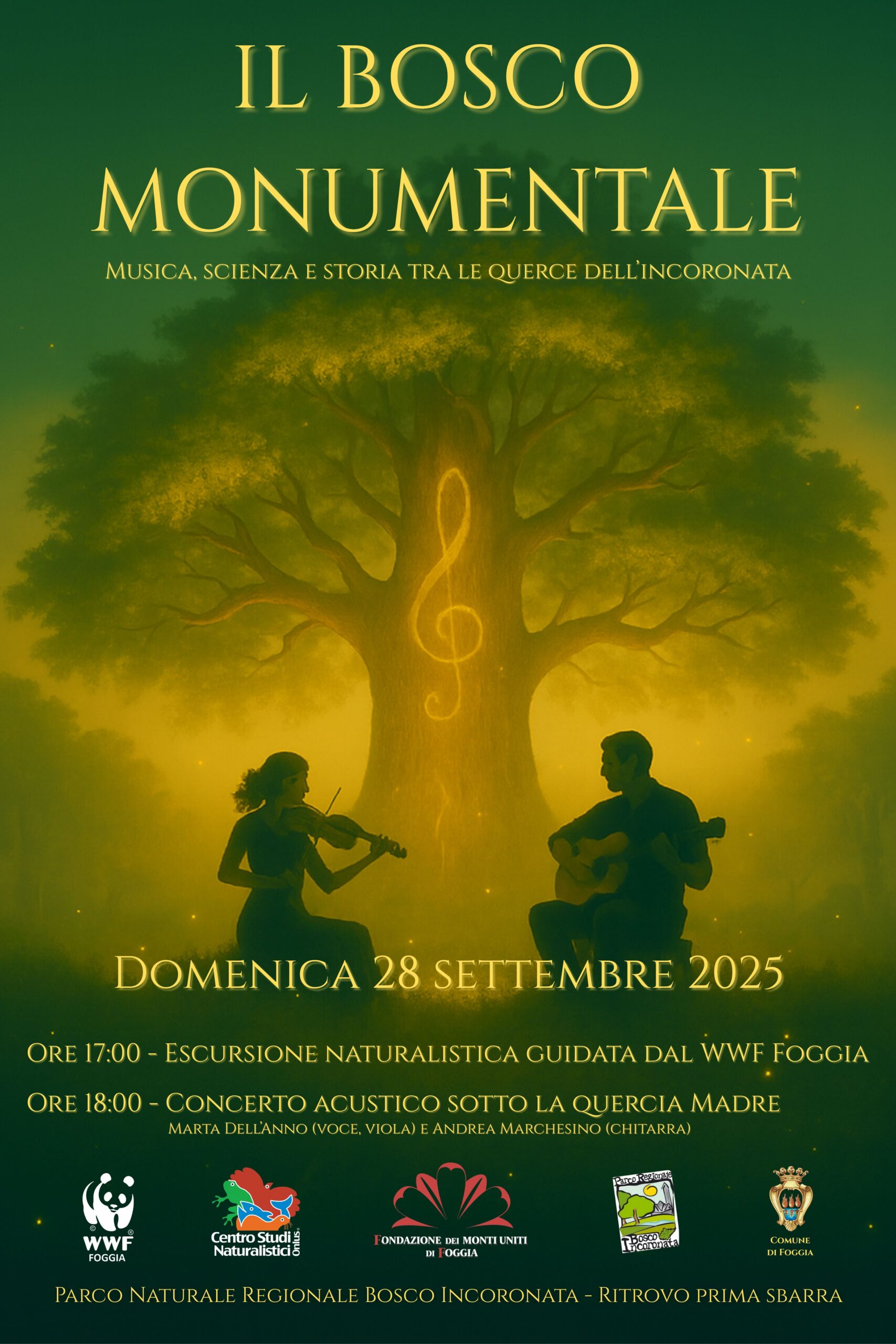 L’evento, organizzato con il patrocinio della Fondazione Monti Uniti, in collaborazione con il Centro Studi Naturalistici, ideato dal delegato al Parco Francesco Strippoli e grazie all’ospitalità del Comune di Foggia, si articolerà in tre momenti principali: una visita naturalistica guidata dal WWF Foggia per scoprire la flora e la fauna del Bosco e gli elementi ecologici dei cinque alberi monumentali protagonisti; l’installazione di targhe divulgative in legno ecocompatibile che raccontano la storia, la botanica e il valore culturale delle querce monumentali; e un concerto acustico del noto duo musicale Marta Dell’Anno e Andrea Marchesino, che suoneranno sotto la Quercia Madre, dove la voce di Marta si unirà alla raffinata strumentazione di Andrea, creando un’armonia intensa e memorabile esaltando il profondo legame tra natura, arte e storia.