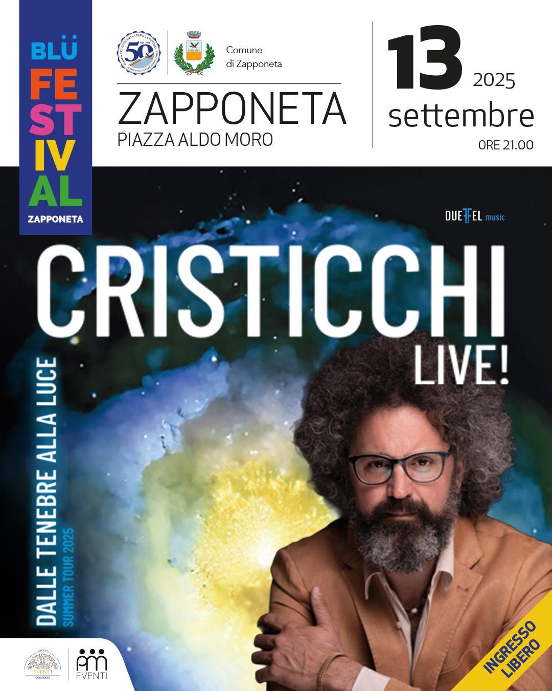 - Sabato 13 settembre, ore 21:30 – Piazza Aldo Moro ospiterà il concerto gratuito di Simone Cristicchi, artista poliedrico e raffinato interprete della canzone d’autore italiana, capace di unire poesia, impegno civile e musica.