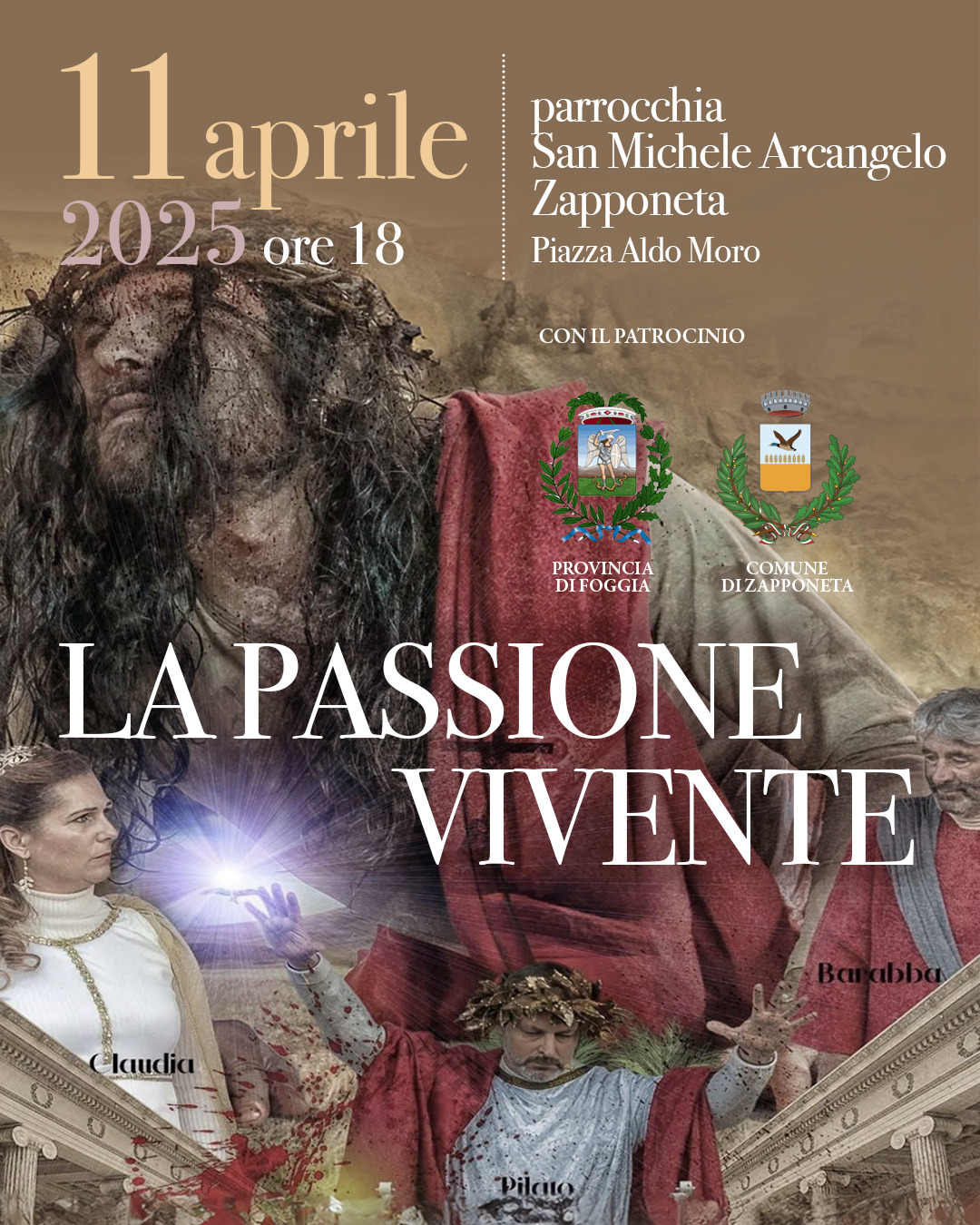 L’evento è organizzato dalla Parrocchia San Michele Arcangelo, con il patrocinio del Comune di Zapponeta, e coinvolgerà l’intera comunità. Infatti, saranno centinaia di figuranti locali a dare vita alle emozioni e al pathos vissuti oltre 2000 anni fa da Gesù di Nazareth, in un’opera corale che unisce fede, tradizione e spirito di partecipazione.